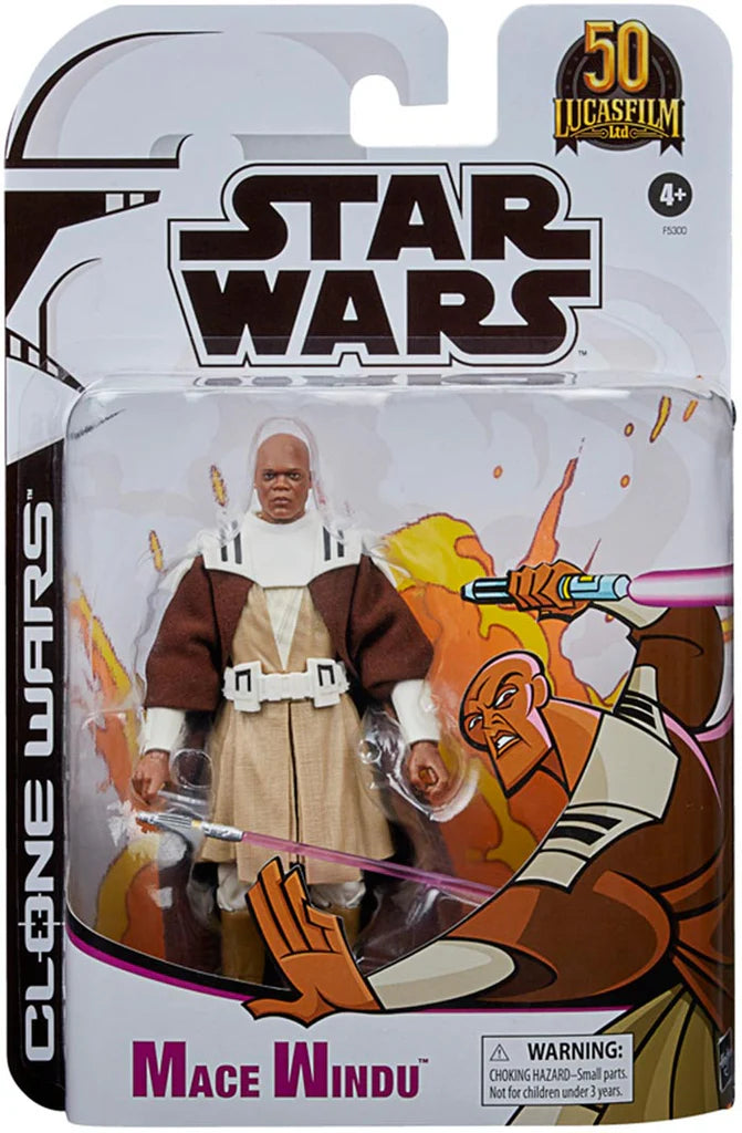 The 6-inch-scale Black Series figure is detailed to look like the Mace Windu character from Star Wars: Clone Wars, featuring premium detail and multiple points of articulation.